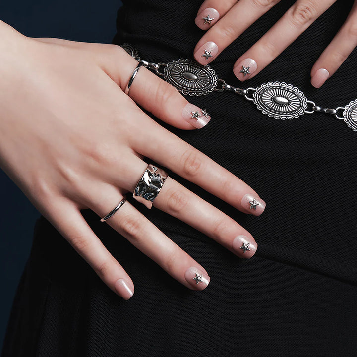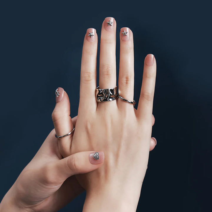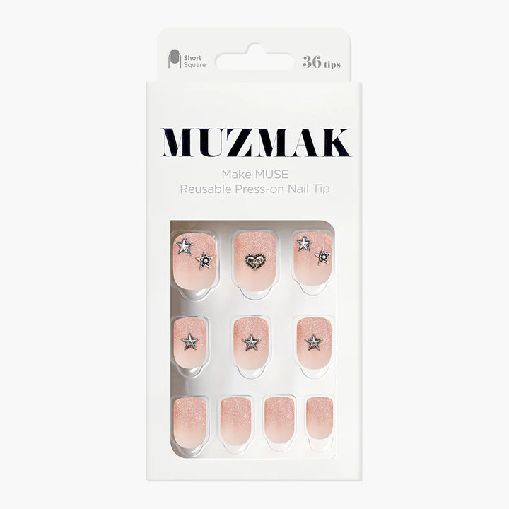 Angel Punk, the charm of contrast with a mysterious glow. Elegant peach-toned pearl gradient adorned with MUZMAK’s signature antique chrome parts exudes refined sophistication. It shines like jewelry, offering a striking and versatile nail look.