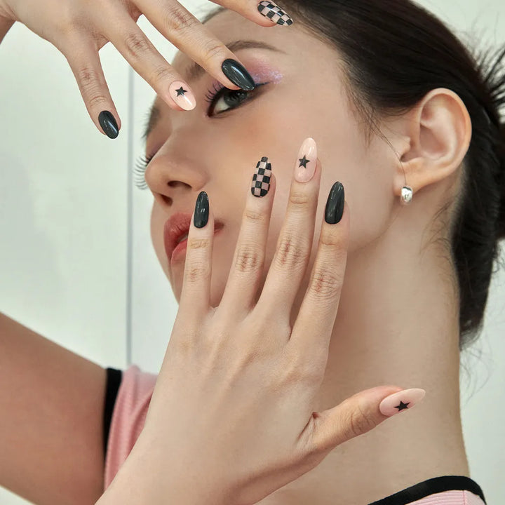 A combination of deep-colored sheer checkerboard and star art. Try adding it to your trendy look.