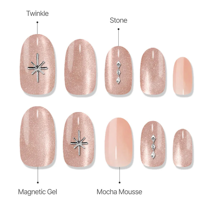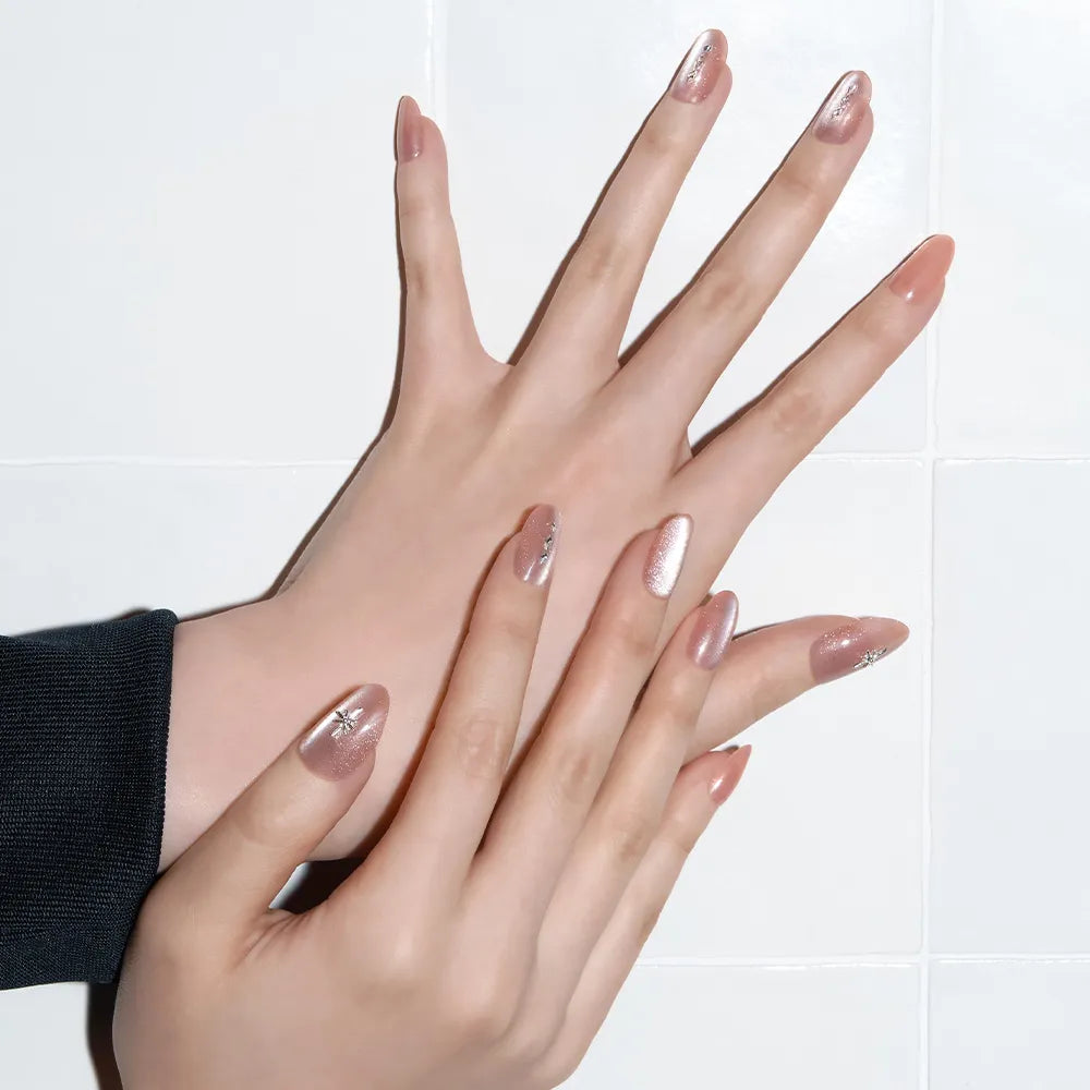 Subtly shifting with the light, the magnetic nails create a mysterious glow, while the micro parts add an unmistakable touch of elegance. Delicately dusted with a soft pearl shimmer, this look will leave you mesmerized by its effortlessly luxurious mood.