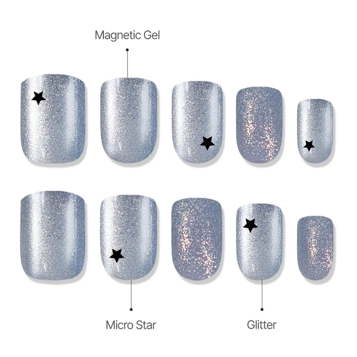 A magnetic nail design with a mysterious, shifting hue, finished with delicate micro star details that feel like stardust on your fingertips. Subtle yet striking, it brings a touch of magic to your everyday look — modern, effortless, and totally captivating.