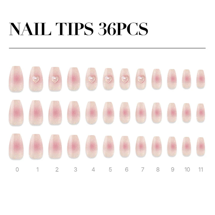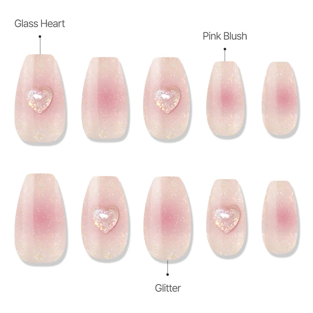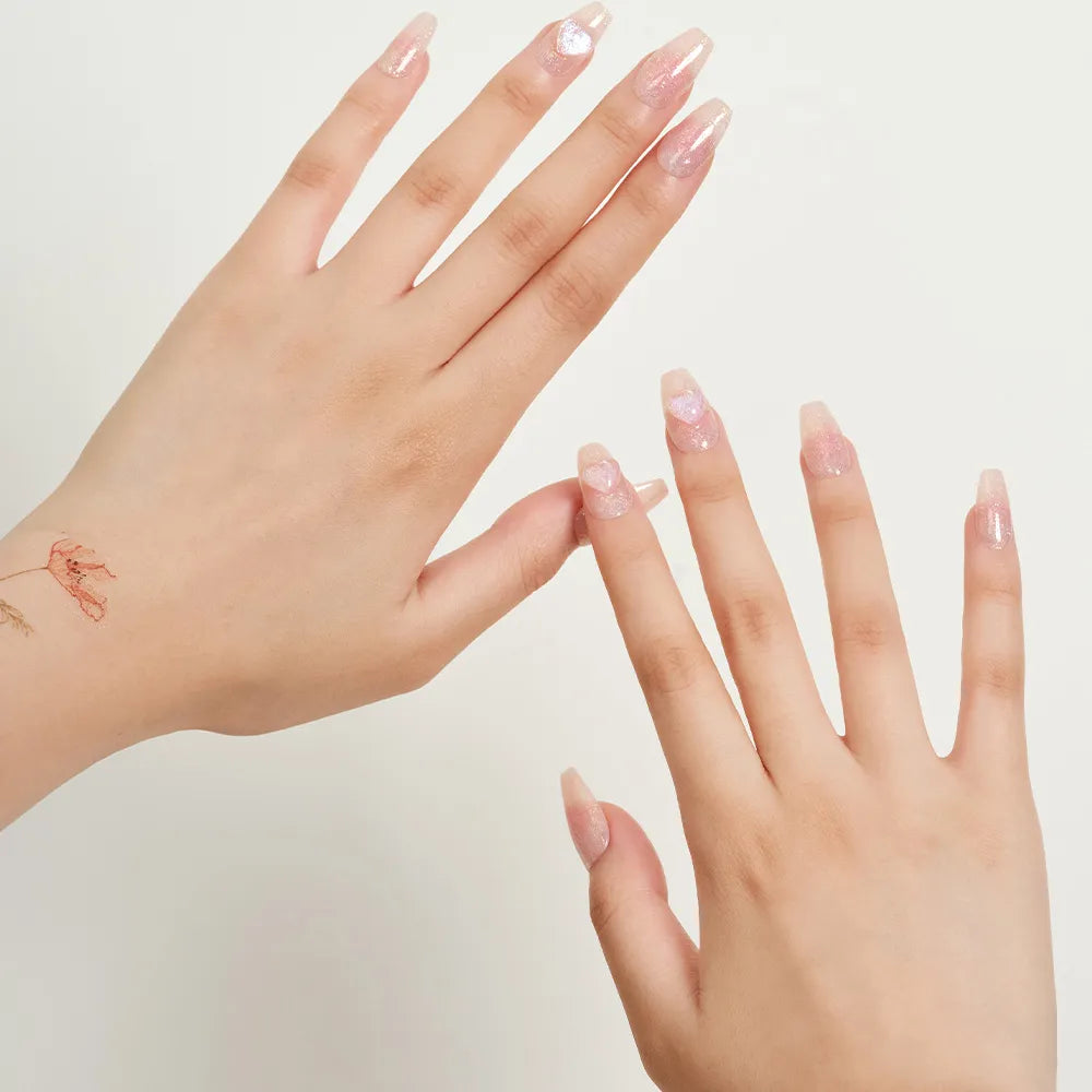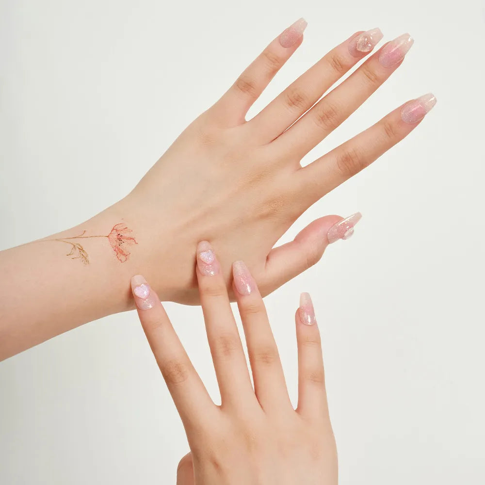 Cheek Gradient Paeony, reminiscent of a rosy flush. A vibrant pink gradient that brightens your hands, paired with holographic heart details and glossy glitter. A versatile point nail that's eye-catching yet never overdone.